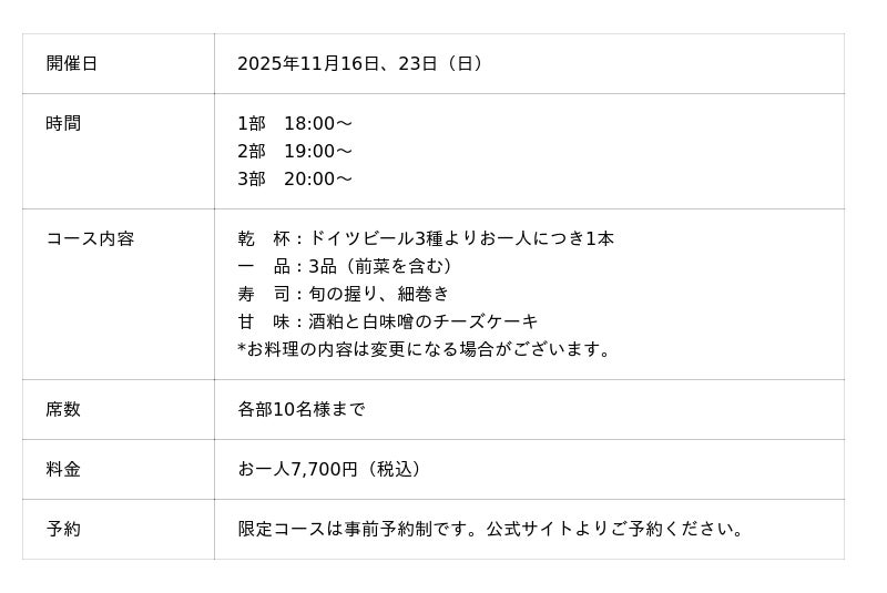 ドイツビールと旬のジャガイモ料理からお寿司まで楽しめる限定コース