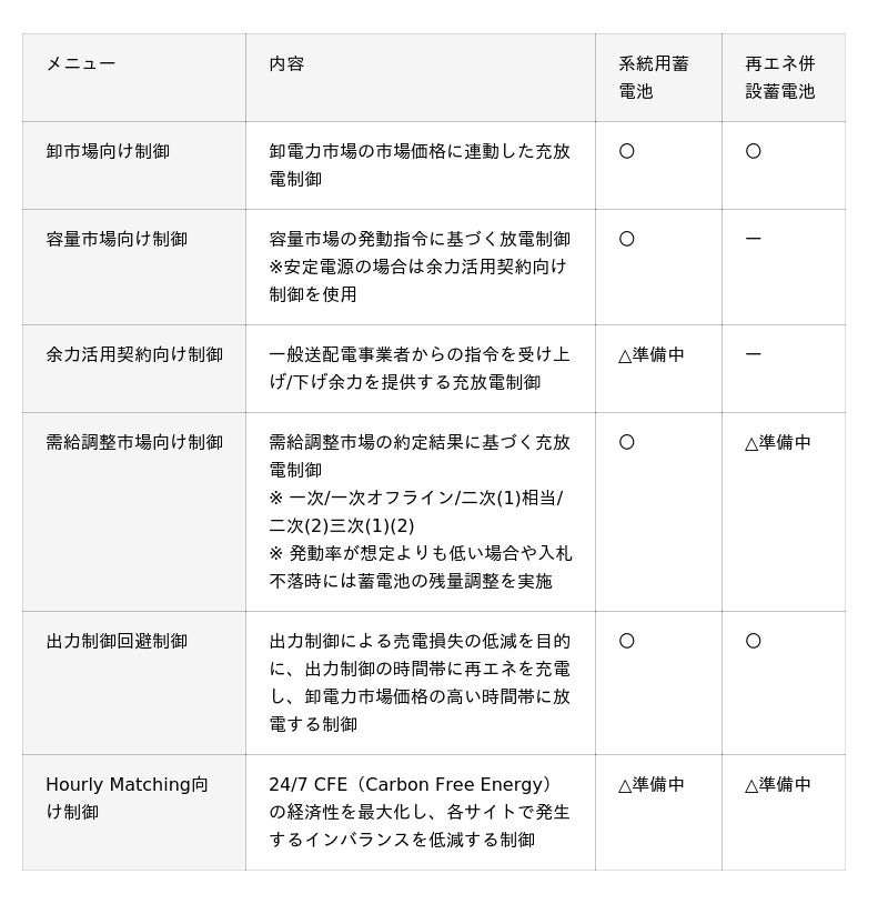 Shizen Connectは、自社で開発・運用するエネルギーマネジメントシステム「Shizen Connect」(以下、「Shizen Connect」)を用いて、系統用及び産業用蓄電池を含む幅広いエネルギーリソースの制御・監視を行ってきました。複数の系統用蓄電池案件の運用代行(*2、*3、*4)及びSaaS(Software as a Service)提供(*5)の実績があり、卸市場向け制御、需給市場の各商品向け制御、容量市場発動指令電源向け制御をはじめとした幅広い制御を提供することが可能です(表1)。
