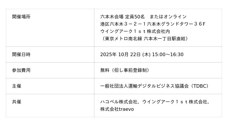 一般社団法人運輸デジタルビジネス協議会(TDBC)は、「中小受託取引適正化法」いわゆる取適法の改正に伴うセミナーを、公正取引委員会をお迎えし、10月22日に開催いたします。