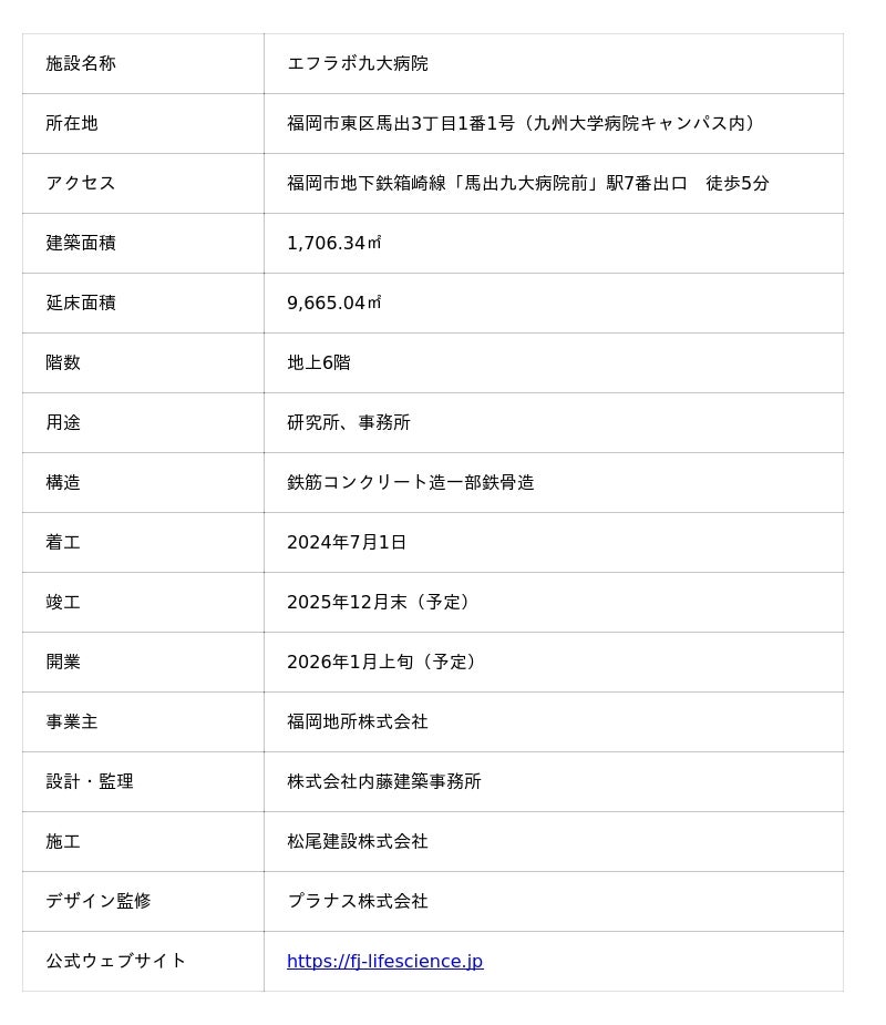 福岡地所株式会社(本社︓福岡県福岡市博多区、代表取締役社長︓榎本一郎、以下「当社」)が福岡市東区馬出の九州大学病院キャンパス内にて建設中である、ライフサイエンス企業向けラボ『エフラボ九大病院』(以下「本施設」)について、以下の通りお知らせします。