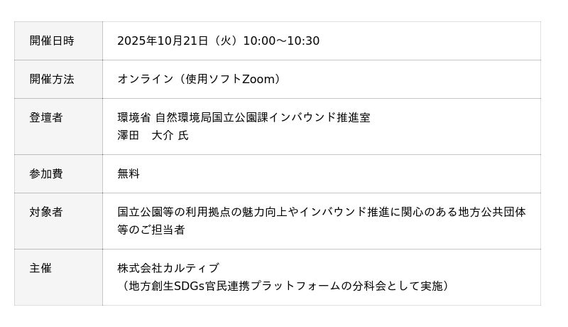 企業版ふるさと納税を活用した地域課題解決プラットフォーム「river(リバー)」を運営する株式会社カルティブ(本社:神奈川県横浜市、代表取締役:池田 清)は各省庁の出している補助金・交付金の活用方法を自治体様向けに伝える「地方創生制度活用シリーズセミナー」として、2025年10月21日(火)に環境省担当者による自治体限定オンラインセミナー「国立公園等の魅力向上・インバウンド推進に向けた環境整備について」を開催します。