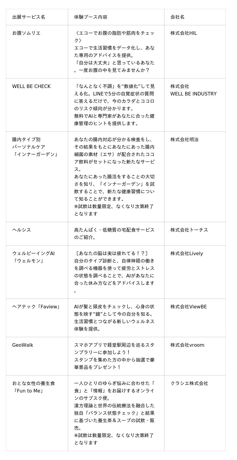 業務提携後の取り組み第一弾として、当社が運営する小田急線経堂駅直結の商業施設「経堂コルティ」にて、2025年11月8日(土)に、様々な未病改善に必要な自分のからだを把握できる体験型健康イベント「からだラボ体験フェス」を開催します。本イベントは、業務提携契約を締結した2社が提供するサービス「お腹ソムリエ(エコーで生活習慣をデータ化し、専用のアドバイスを提供)」や「WELL BE CHECK(カラダとココロのリスク傾向を分析)」に加えて、株式会社明治による「腸内タイプ別パーソナルケア『インナーガーデン』」など全8社の健康体験ブースが出展します。ワークショップとしては、薬剤師と学ぶ 冷え性さんのための「おいしい漢方チャイキット作り」も実施。また、本イベントと同時開催で、親子で楽しめる体験型のワークショップとして、「とびだす!おえかきAR体験(お子さまが描いた絵がまるで魔法のように動き出す)」も開催するほか、健康体験ブースやワークショップへのご参加で、館内の人気焼肉店・叙々苑のお食事券やタリーズコーヒーのギフト券などが当たる「抽選会」もご用意。秋の一日を楽しく過ごしながら、ご自身のからだと向き合う新しい体験を提供します。