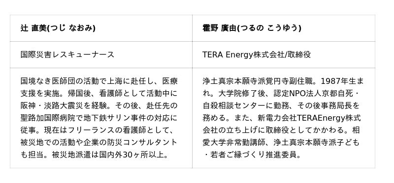 お寺と防災の掛け合わせにどんな可能性があるのか。お寺という“場”が持つ力と、その活用の可能性について、国際災害レスキューナースの辻直美さんとTERA Energyの霍野廣由が対談しました。対談内容は、以下をご覧ください。