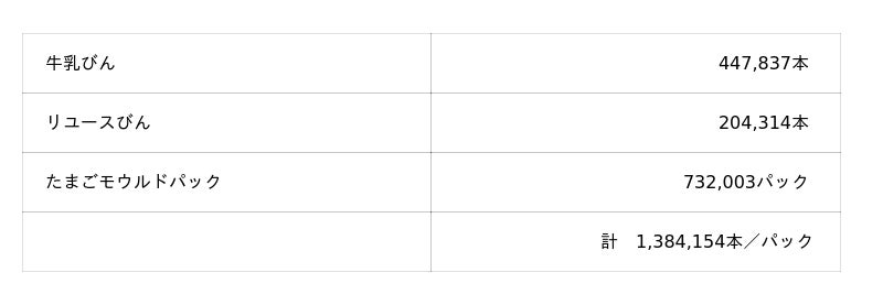 l 再使用・回収された容器・資材の総量:約1,384,000本・パック、約320トン