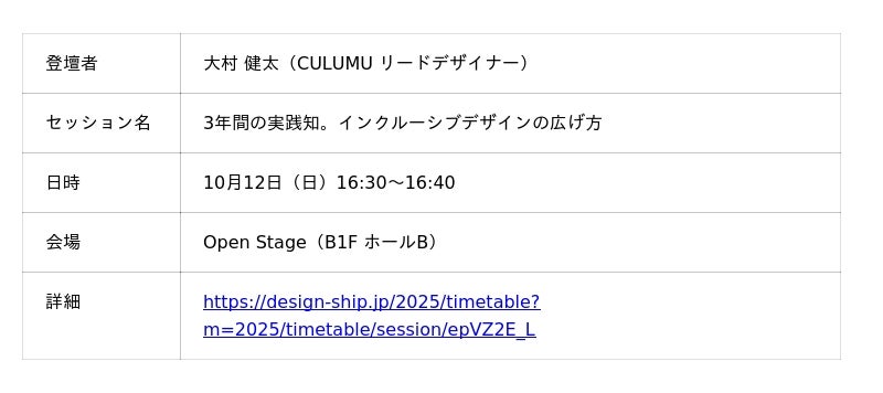 Designship 2025ではブース出展に加え、インクルーシブデザインスタジオCULUMUの事業責任者の川合俊輔とリードデザイナーの大村健太がそれぞれ登壇します。