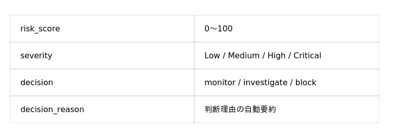 これにより、セキュリティ運用者は「即遮断」「観察継続」などの判断を自動化できます。