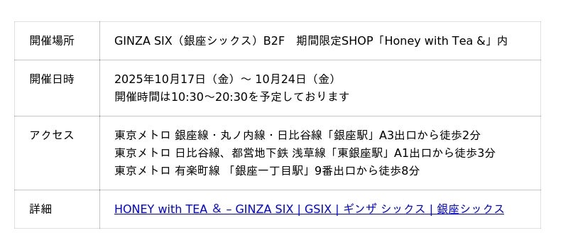 2025年10月17日から24日まで、GINZA SIX B2F「Honey with Tea &」内で期間限定でグラノーラ限定セットを販売