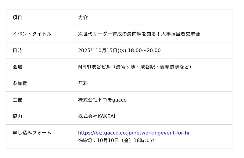 本イベントは、NTTドコモ、NTT、大成建設、IHIといった大手企業の人事部門が登壇し、次世代リーダー育成の最新事例をピッチ形式で紹介する、人事担当者向けの情報交換とネットワーキングの場です。KAKEAIの皆川は、ドコモgaccoとのトークセッションに登壇し、企業の成長に不可欠な次世代リーダー育成について議論を深めます。