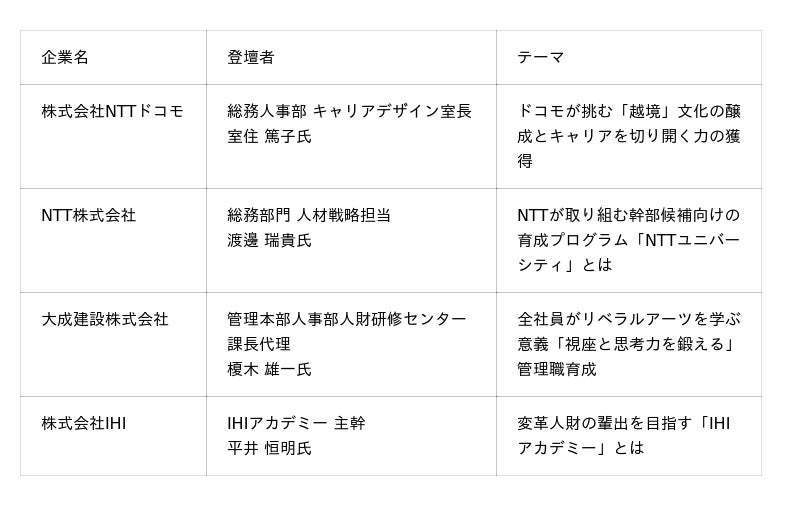 NTTドコモ、NTT、大成建設、IHIなど有名企業が次世代リーダー育成の最新事例を紹介
