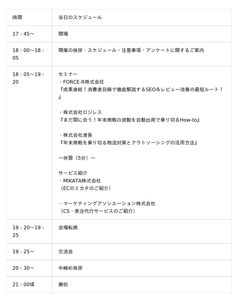 ECサイトの運営代行サービスを提供しているマーケティングアソシエーション株式会社(本社:東京都台東区 代表取締役:中園広和、以下当社)は、2025年10月29日(木)にリアルイベント「【第11回 EC事業者交流会】~年末商戦・繁忙期を勝ち抜け!~ EC事業者限定! プロと直接相談できる交流会」を、FORCE-R株式会社、株式会社ロジレス、株式会社清長、MIKATA株式会社と共催いたします。