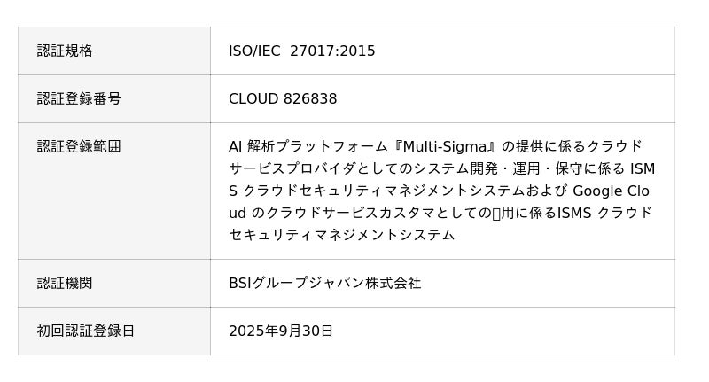 ノーコードAI解析プラットフォームMulti-Sigma(R)を開発・提供する株式会社エイゾス(本社:茨城県つくば市、代表取締役 河尻理恵子、以下「エイゾス」)は、情報セキュリティマネジメントの国際規格ISO 27001およびクラウドサービスのセキュリティ管理に関するISO 27017の認証を、BSIグループジャパン株式会社を認証機関として2025年9月30日に取得しました。今回の取得により、自社業務および提供サービスにおけるセキュリティ統制と運用基盤の継続的改善を推進します。