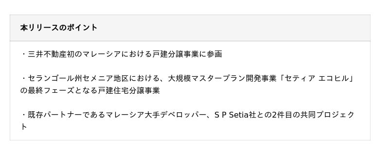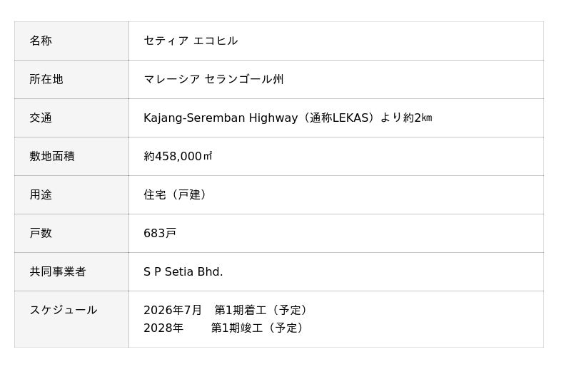 三井不動産株式会社(所在:東京都中央区、代表取締役社長:植田 俊、以下、「当社」)は、Mitsui Fudosan (Asia) Malaysia Sdn. Bhd.(マレーシア三井不動産株式会社、所在地:クアラルンプール)を通じて、マレーシア・セランゴール州、セメニア地区における大規模マスタープラン開発計画「セティア エコヒル(Setia EcoHill)」(以下、「エコヒル開発計画」)における、合計683戸の戸建住宅分譲事業(以下、「本事業」)への参画を決定したことをお知らせいたします。本事業が加わり、当社のマレーシアでの住宅分譲事業は計6事業、その他商業施設事業や賃貸住宅事業、物流事業を加えると計10事業となります。