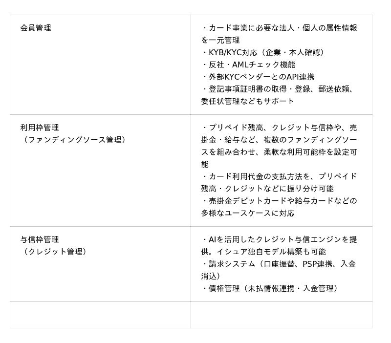 今回の最新版では、従来の標準機能に加え、開発負荷の高い「会員管理」「ファンディングソース(利用可能枠)管理」「クレジット(与信)管理」を統合的に実装。これにより、最小限の開発工数での自社ブランドのクレジットカード、プリペイドカード、デビットカードなど(以下、「自社カード」)事業の立ち上げが導入企業において可能となります。