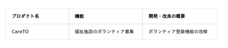 善光総研は、今回の開発・改良に関して、事業モデルの検証支援を提供しました。善光総研との連携のもと、【けあばーす株式会社】の製品である【CareTO】について下記のとおり開発・改良を実施しました。