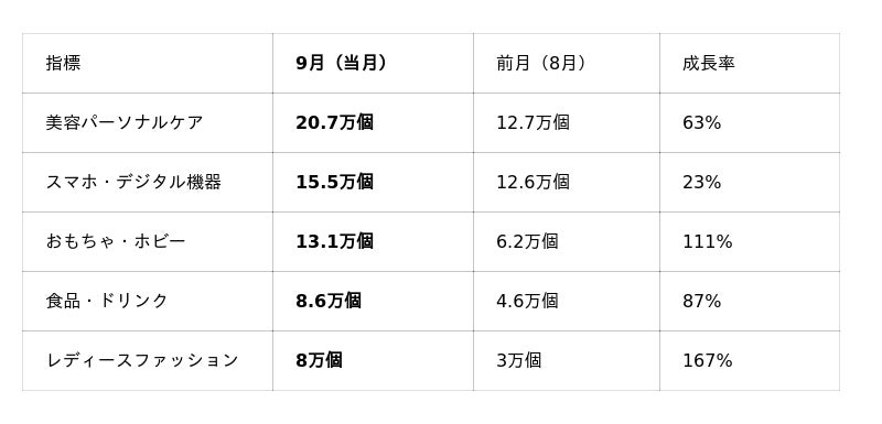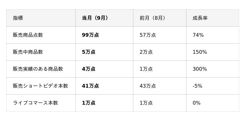 また、トップの「美容パーソナルケア」も63%と高い成長率が続いていますが、当カテゴリーはライブ配信経由の販売比率が「8月 18% → 9月 32.4%」と大きく増加しています。