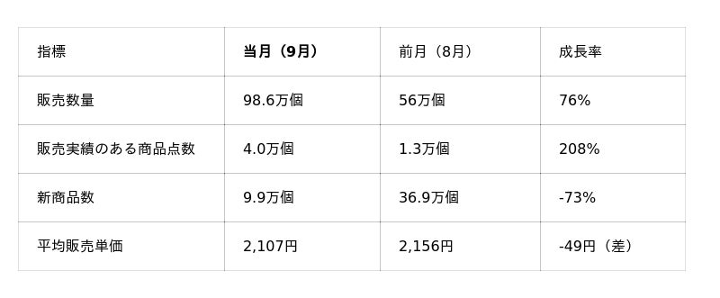 7月→8月のGMV成長率"201%"と比べ鈍化したものの、成長率"73%"と引き続き大きくマーケット成長が続いています。