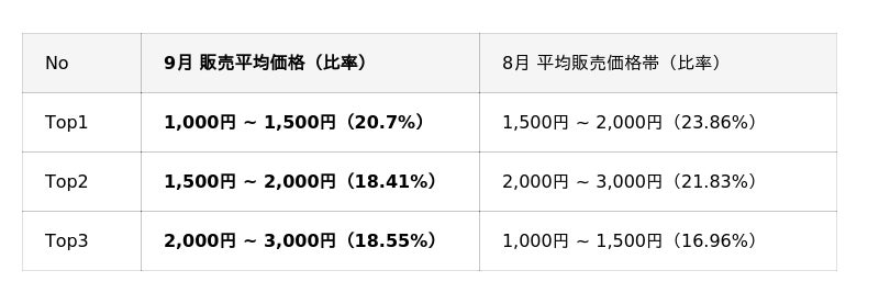 1,000円 ~ 3,000円の1商品あたりの価格帯が売れ筋ラインである点は、TikTok Shopローンチ直後の7月より変化はありませんが、 若干ではありますが平均単価が下落傾向となっています。