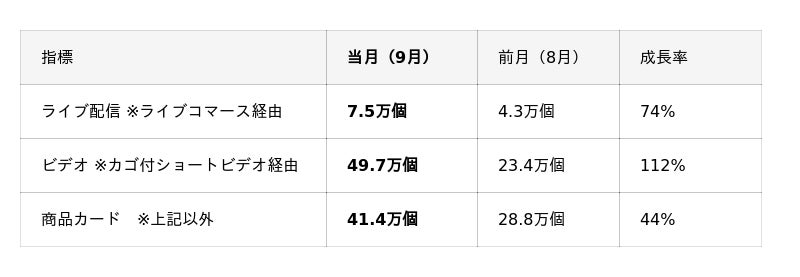 ※商品カードはショップタブ、TikTok内遷移、外部遷移が主に該当し「ライブ配信」「ビデオ」以外の数字が全て含まれます。
