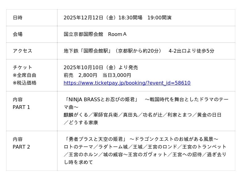 これに合わせて「NINJA BRASSとお忍びの姫君」によるコンサートが、12月12日(金)に国立京都国際会館、12月20日(土)にパシフィコ横浜・会議センター メインホールで開催されます。