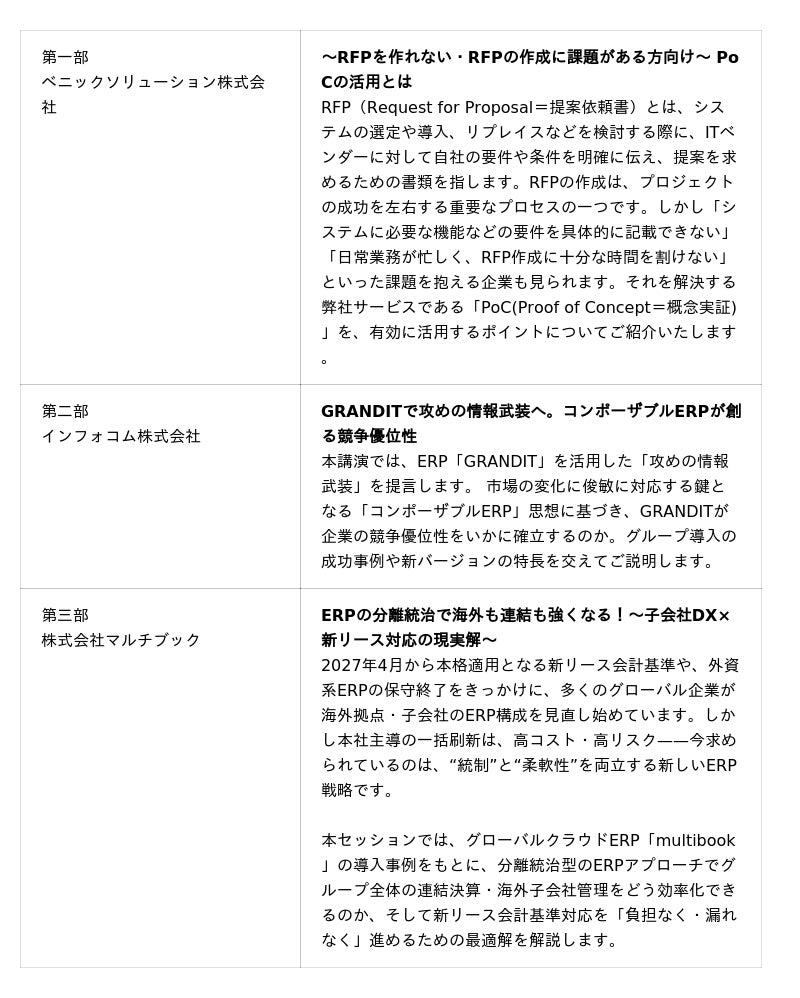 本セミナーでは、PoCを活用したRFP策定支援から始まり、コンポーザブルERP「GRANDIT」「multibook」による全社最適化の実現、そして海外拠点や連結決算を強化する分離統治型ERPアプローチまで、段階的にDXを推進するための実践的アプローチを、豊富な導入事例を交えてご紹介します。