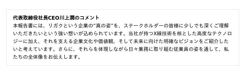 本報告書は、リガクグループの資本活用、技術の追求、事業活動、そしてグローバルな成長戦略をステークホルダーの皆さまにお伝えするために制作しました。あわせて、2024年12月期の財務・非財務成績と活動も掲載しています。ぜひご一読いただき、「One-of-a-Kind Global Technology Company」を目指し、X線分析ソリューションを通じて世界の技術的発展に貢献するリガクグループの姿を知っていただければ幸いです。