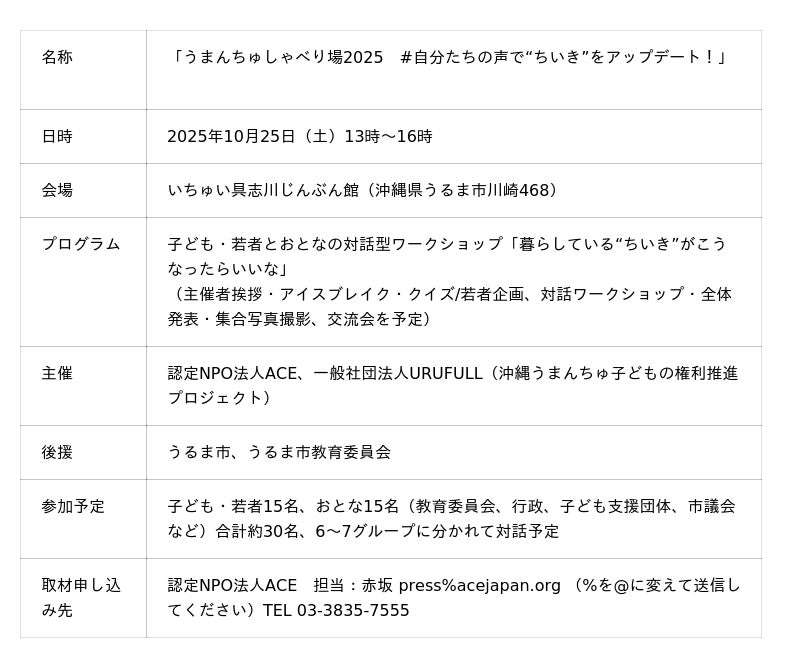認定NPO法人ACE(東京都台東区/代表 岩附由香)は、一般社団法人URUFULL(沖縄県うるま市/代表理事 平林勇太)と共催で、2025年10月25日(土)に沖縄県うるま市にて、子どもの意見を聴き施策に反映できる社会を目指して「うまんちゅしゃべり場 子ども・若者とおとなの対話型ワークショップ」を開催します。