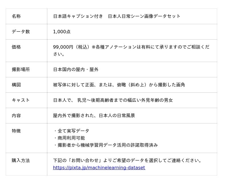 機械学習用画像・動画データ提供サービス」として、「日本語キャプション付き 日本人日常シーン画像データセット」を販売いたします。
