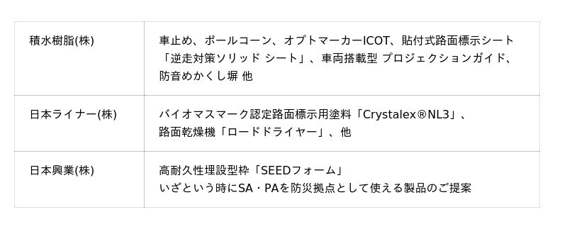 積水樹脂株式会社(本社:大阪市北区、代表取締役社長 兼 CEO 馬場浩志)は、グループ会社の日本ライナー株式会社、関連会社の日本興業株式会社とともに、2025年10月16日(木)~17日(金)に東京ビッグサイトで開催される「ハイウェイテクノフェア2025」に出展します。