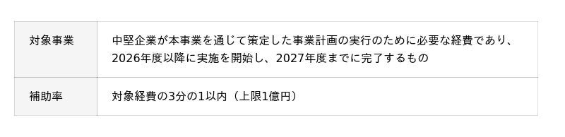 本事業の支援対象に採択された中堅企業を対象に、本事業を通じて策定した事業計画の実行のために必要な経費を支援する補助事業を予定しています(2026年度開始予定)。詳細については、事業ウェブサイト上にて2026年度に公表を予定しています。