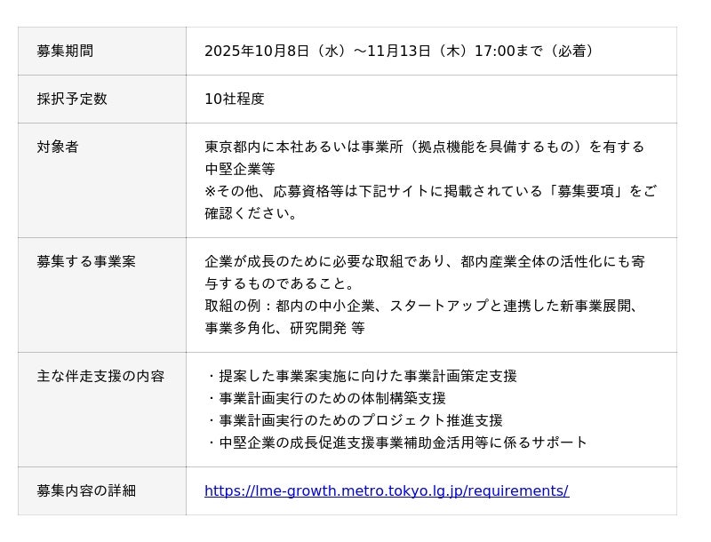 本事業では、都内経済の成長を牽引し、さらなる飛躍を目指す中堅企業を対象に、事業の計画策定、事業の実現に向けた体制構築や計画実行を支援します。また、事業の実行に向けて取り組む、人材育成、研究開発に必要な機械設備投資、中小企業やスタートアップとの連携(オープンイノベーションやM&Aなど)に必要な経費についても併せて支援します。
