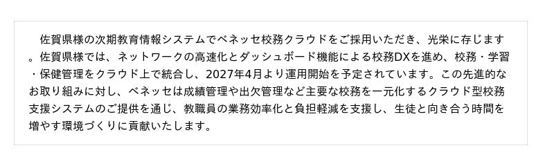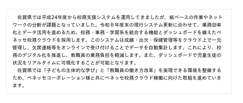 「ベネッセ校務クラウド」が佐賀県教育委員会の次世代校務支援システムとして採択