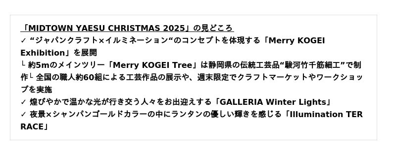 “ジャパンクラフト×イルミネーション”をコンセプトに、幻想的な空間で職人たちの手しごとを体感「MIDTOWN YAESU CHRISTMAS 2025」
