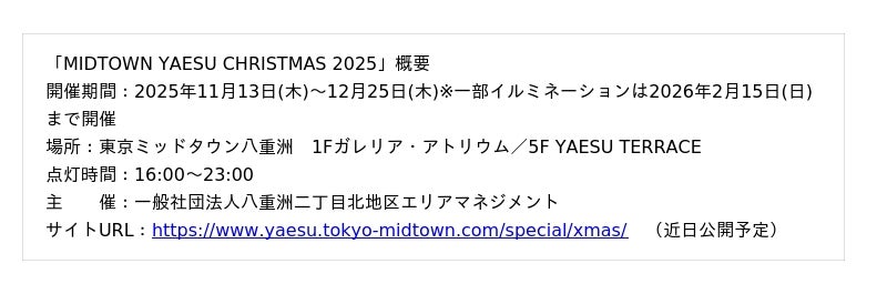 東京ミッドタウン八重洲(所在地:東京都中央区)では、2025年11月13日(木)~12月25日(木)の期間、クリスマスイベント「MIDTOWN YAESU CHRISTMAS 2025」を開催いたします。