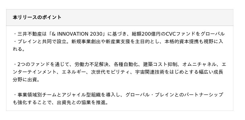 三井不動産、グローバル・ブレインと共同で総額200億円のCVCを新設