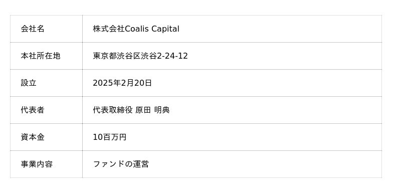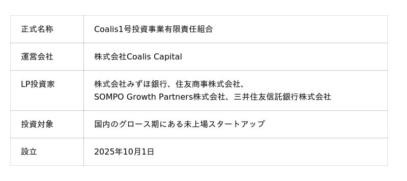 株式会社Coalis Capital(代表取締役:原田 明典、以下「Coalis Capital」)は、プライベートエクイティファンド「Coalis1号投資事業有限責任組合」(以下「Coalis1号ファンド」)を設立し、このたびファーストクローズを完了いたしました。