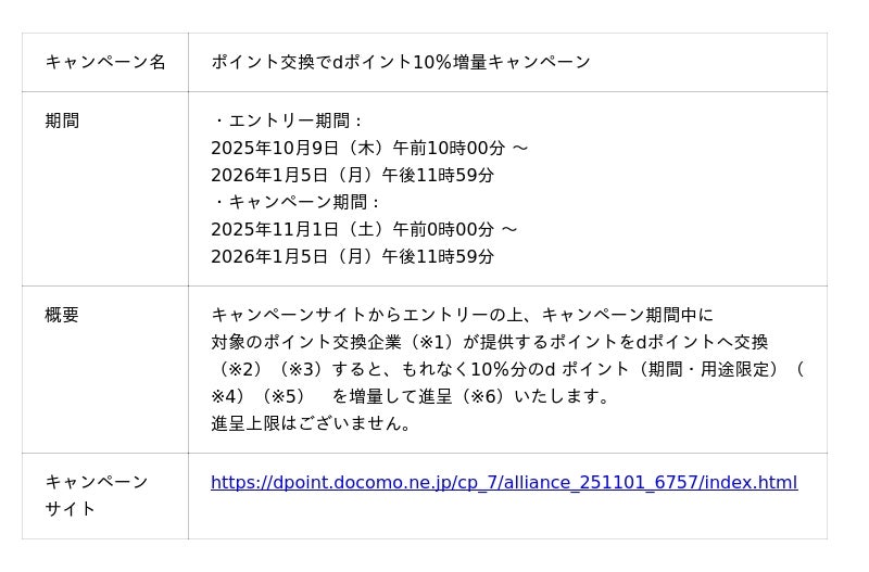 本キャンペーンの参加にはエントリーが必要で、エントリーは2025年10月9日(木)から受付開始いたします。キャンペーン期間中、対象企業のポイントをdポイントへ交換(※2)(※3)することで、もれなく10%分のdポイント(期間・用途限定)(※4)(※5)を増量して進呈(※6)いたします。進呈上限はございません。