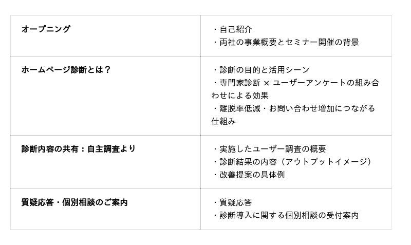 本ウェビナーでは、U'eyes Design様との共催セミナーとして、売上・反響を最大化する「ホームページ診断」導入というテーマで、成果を生み出すWEBサイト運用について解説します。