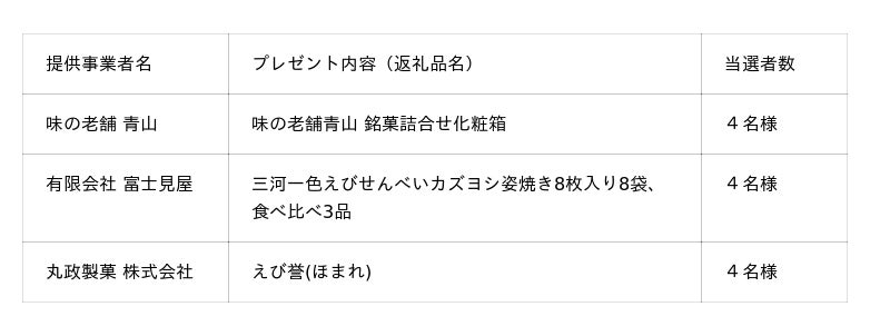 本キャンペーンでは、西尾市ふるさと納税自慢の三河一色えびせんべい3品をそれぞれ4名様、合計12名様にプレゼント。