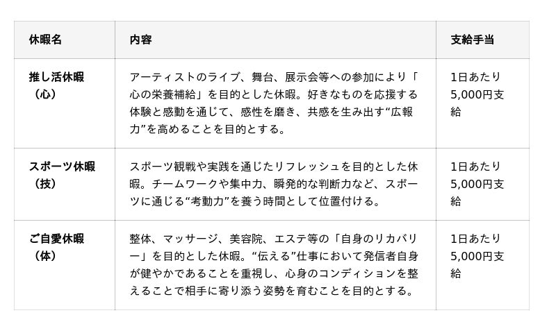 自分の“好き”を磨くことが、結果的に他者の心を動かす“伝える力”につながり、私たちの仕事力アップにも繋がる──その考え方が、この休暇制度の根底にあります。