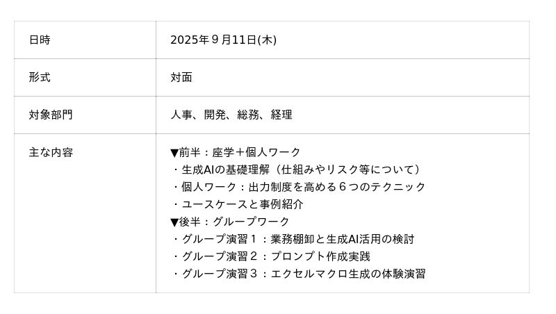 生成AIの普及が加速する一方で、多くの企業では「どのように業務へ取り入れるべきか」という課題を抱えています。当社においても、生成AIの中長期的な導入計画はこれから検討する段階であり、まずは経営層を含む複数部署のメンバーが基礎を理解し、具体的な活用イメージを持つことが重要と考えられました。そこで両社は、経営層を含めた人事・開発・総務・経理部門のメンバーを対象に、『基礎理解』と『実践的検討』をテーマにしたワークショップを実施し、参加者自身が手を動かしながら生成AIの仕組みや使い方を学ぶとともに、自身の業務にどのように活かせるかを考える機会を設けました。