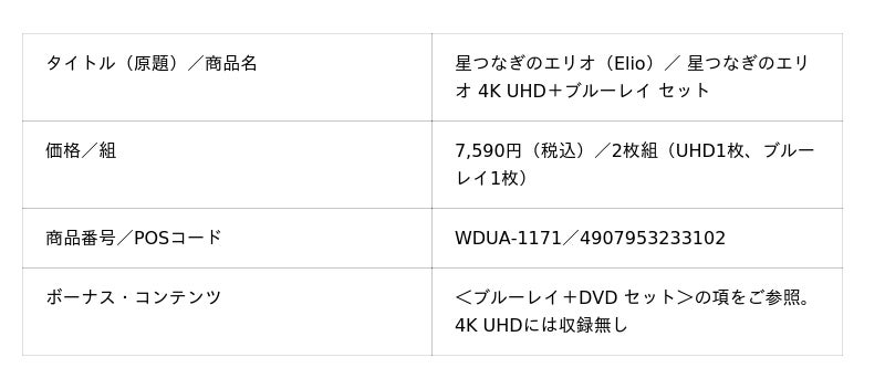 この度発売のブルーレイ+DVDセット、4K UHD+ブルーレイ セット、デジタル配信(購入)には、映画の舞台裏を紐解く「コミュニバースの世界へ」を始め、エリオ役ヨアス・ギブレアブとグロードン役のレミー・エジャリーが本物の宇宙飛行士にインタビューする「宇宙について」、家族で楽しめる「ウゥゥゥゥとグロードンを描いてみよう」、ピクサーの世界をより体感できる「探してみよう!ピクサー・トリビア」、楽しいアフレコ収録の様子が分かる「アフレコ現場の裏側」、そして、惜しくも本編には収録されなかった「未公開シーン」など、充実したボーナス・コンテンツを収録!『リメンバー・ミー』のディズニー&ピクサー史上最も“やさしい”感動の物語『星つなぎのエリオ』を、ぜひブルーレイ+DVDセット、4K UHD+ブルーレイ セット、デジタル配信(購入/レンタル)で、お楽しみください!