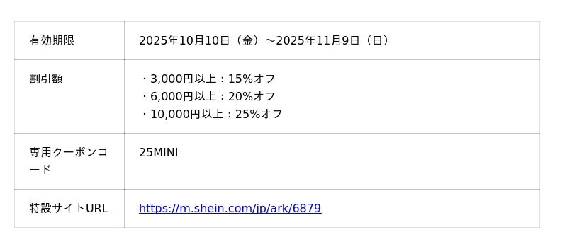 ※各キャンペーンの注意事項につきましては、「SHEIN」Webサイト・アプリ内をご参照ください。