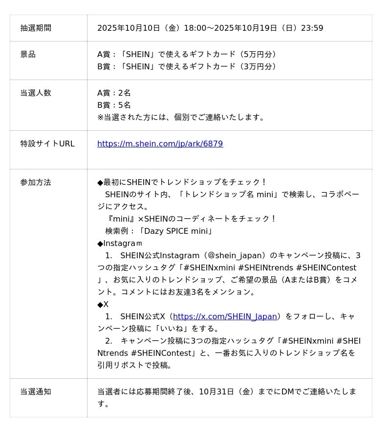 『mini』×SHEINコラボレーションを記念し、SHEINで使えるギフトカードが7名様に当たるSNSキャンペーンを実施いたします。