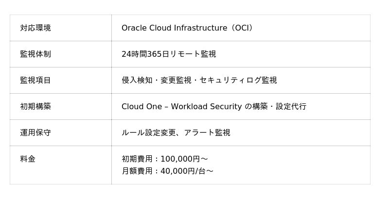 お客様の OCI 環境における Cloud One - Workload Security の構築、および侵入検知/変更監視/セキュリティログ監視のためのルール設定を代行します。さらに、Cloud One - Workload Security のルール追加や変更などの設定を代行します。また、アイレットのエンジニアが24時間365日リモートでアラートを監視し、アラートが確認された場合、お客様指定の連絡先にご報告します。