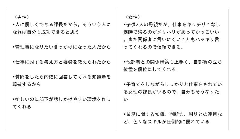 女性の回答者からは「女性管理職がいないため、そもそも目指すべき対象がいない」という声もありました。