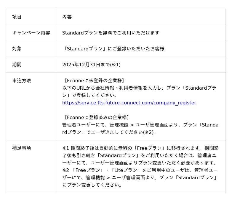 より多くのSES事業者の皆様に、Fconneの便利さを実感していただきたく、この度、無料キャンペーンを開催することにいたしました。この機会に全機能が利用できる『Standardプラン』をぜひお試しください。