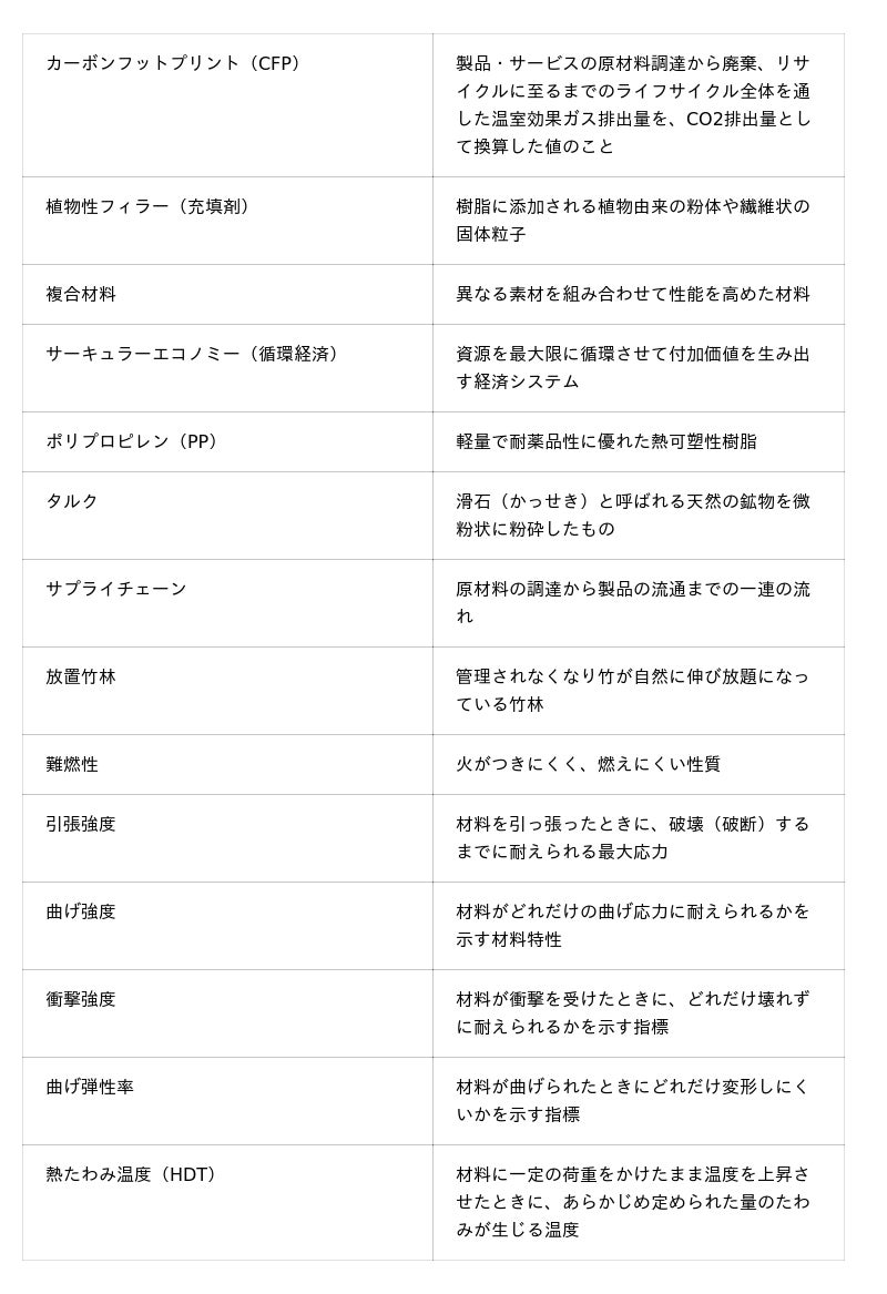 ポリプロピレン(PP)とタルクやグラスファイバーとの複合材料など、従来から用いられている化石燃料由来の樹脂材料は、高い信頼性と性能を提供しますが、利用に伴う炭素排出量の増加が課題でした。2050年のカーボンニュートラル実現と、自動車分野でのサーキュラーエコノミー(循環型経済)を推進するため、従来のポリプロピレン/タルク複合材料の代替品として、植物性フィラー(竹)を用いたポリプロピレン/竹複合材料を開発しました。開発した複合材料は、植物性フィラーの利用による樹脂を減らす効果に加えて、竹が吸収した二酸化炭素を、「缶詰」のように内部に保持できるため、約50%のカーボンフットプリント削減と、従来同等以上の機械的性能を両立します。