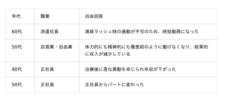 がん治療に伴う収入減少の理由:自由回答