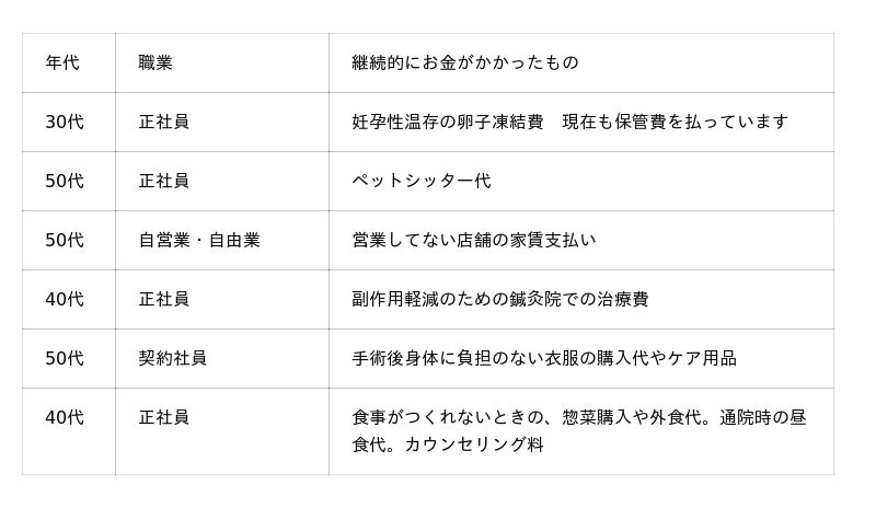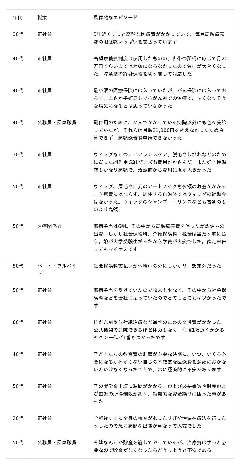 調査結果から見えてきたのは、がん診断後の「お金の悩み」は、治療費だけにとどまらないことです。通院のための交通費、副作用を抑えるための費用やアピアランスケアなど、治療に向き合う中で発生する費用がかさむことや、収入が減少する一方で社会保険料の負担が厳しいことなど、「お金の悩み」は多岐にわたります。