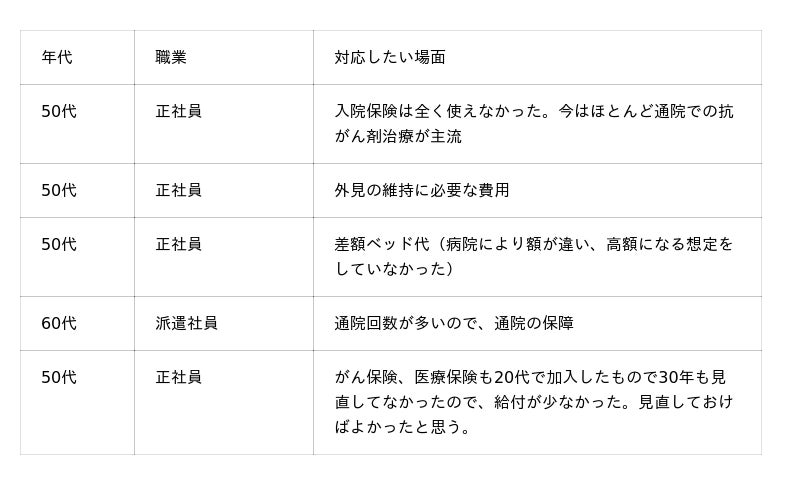 今回の調査では、「公的制度ではお金が足りなかった」「がん保険を契約していたが、給付金を受け取れなかった」という声も見られました。高額療養費制度の見直しの動きがあったり、がん治療が入院から通院主体に変わってきていたりと、時代や制度の変化にあわせて、がんの治療をしながら働き続けるためにも、民間の保険の定期的な見直しが必要だと言えるでしょう。